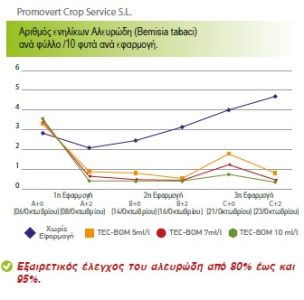 TEC-BOM has demonstrated excellent efficacy against whiteflies (Bemisia tabaci, Trialeurodes vaporariorum), with control levels ranging from 80% to 95%. The following graphs present the results of field trials conducted on tomato crops by Promovert Crop Service S.L.