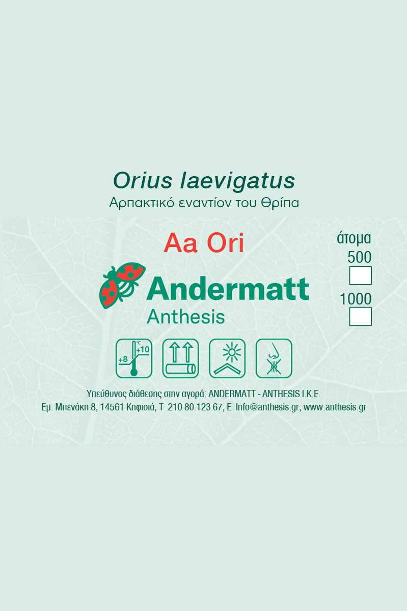 Το Aa Ori είναι ένα φυσικό αρπακτικό έντομο (Orius laevigatus) για βιολογική καταπολέμηση του θρίπα (Thrips tabaci, Frankliniella occidentalis) σε θερμοκηπιακές και υπαίθριες καλλιέργειες. Προσφέρει γρήγορη εγκατάσταση και αποτελεσματική δράση, τόσο σε προληπτικές όσο και σε θεραπευτικές εφαρμογές.